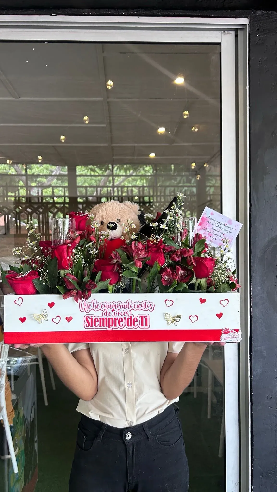 Sorprende a tu ser querido con esta encantadora Caja de Regalo Amoroso que incluye un hermoso mix de flores, un tierno peluche, 2 copas de vidrio, botella de vino y una dosis extra de amor. El regalo perfecto para expresar tus sentimientos y hacer que su día sea inolvidable. ¡Hazle saber cuánto le importas!
